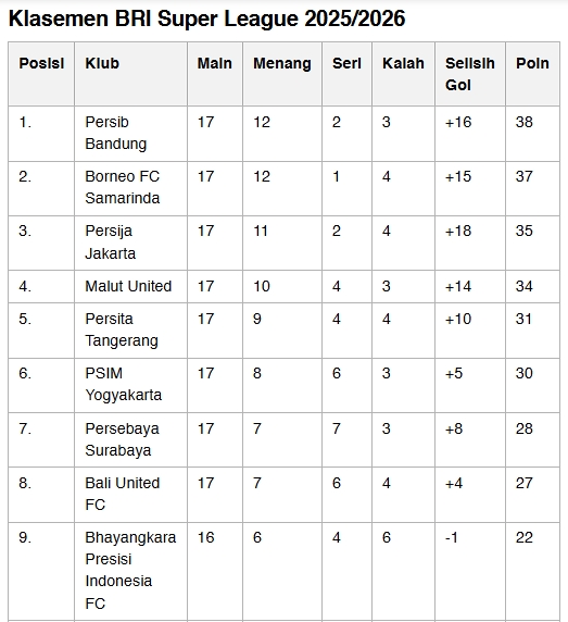 Keberhasilan Persib Bandung menutup paruh pertama liga di posisi teratas menjadi catatan manis bagi perjalanan klub musim ini. Dengan selisih poin yang cukup ketat di papan atas, termasuk jarak dari Persija Jakarta dan Malut United, persaingan di putaran kedua diprediksi akan semakin menarik untuk diikuti.