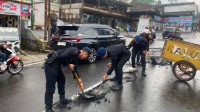 Brimob Polda Jabar Bersihkan Material Sisa Aspal Akibat Hujan Deras di Cikole Lembang