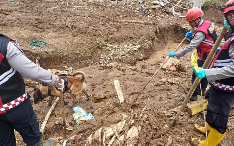 Kemampuan penciuman tajam kedua satwa ini menjadi tumpuan harapan dalam mendeteksi keberadaan korban yang diduga tertimbun di kedalaman material longsoran.