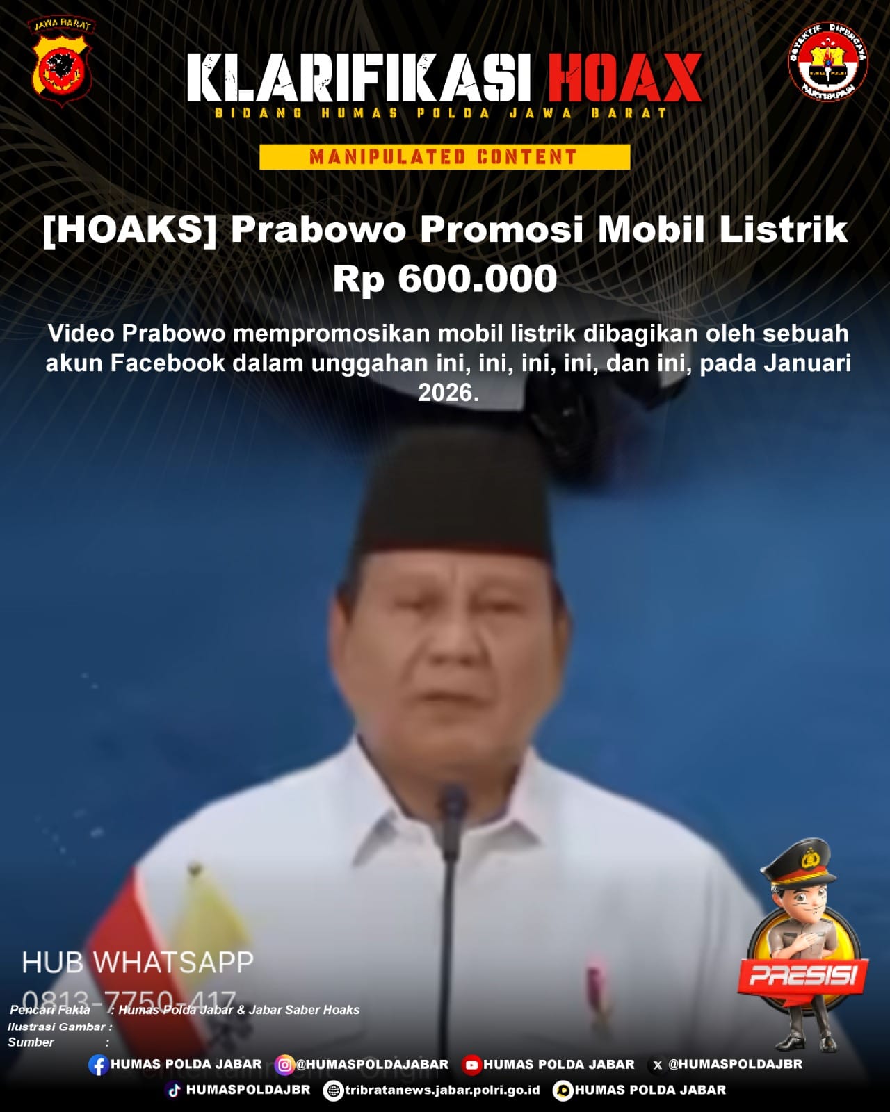 Berdasarkan penelusuran Tim Cek Fakta, video Prabowo mempromosikan mobil listrik Rp 600.000 yang beredar di Facebook adalah hoaks.