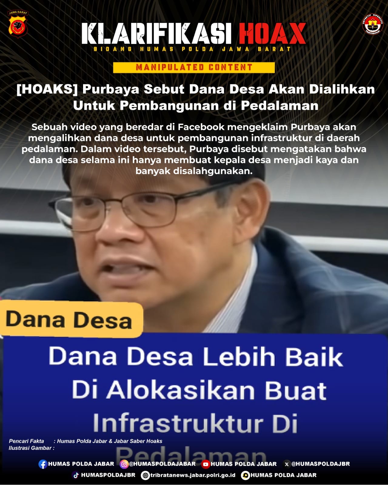 Video Purbaya akan mengalihkan dana desa untuk pembangunan infrastruktur di daerah pedalaman merupakan konten hasil manipulasi.