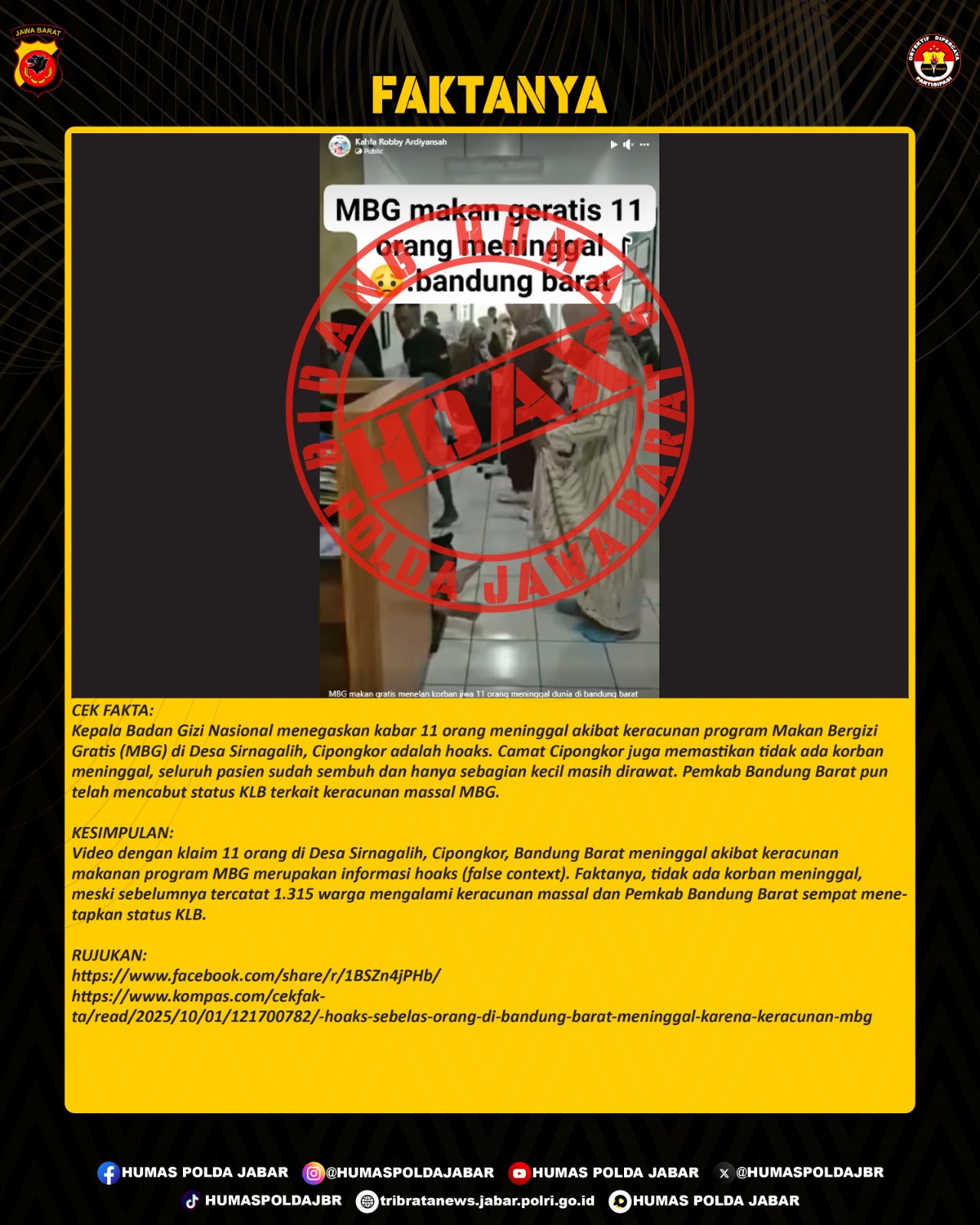 Kepala Badan Gizi Nasional menegaskan kabar 11 orang meninggal akibat keracunan program Makan Bergizi Gratis (MBG) di Desa Sirnagalih, Cipongkor adalah hoaks. Camat Cipongkor juga memastikan tidak ada korban meninggal, seluruh pasien sudah sembuh dan hanya sebagian kecil masih dirawat. Pemkab Bandung Barat pun telah mencabut status KLB terkait keracunan massal MBG.