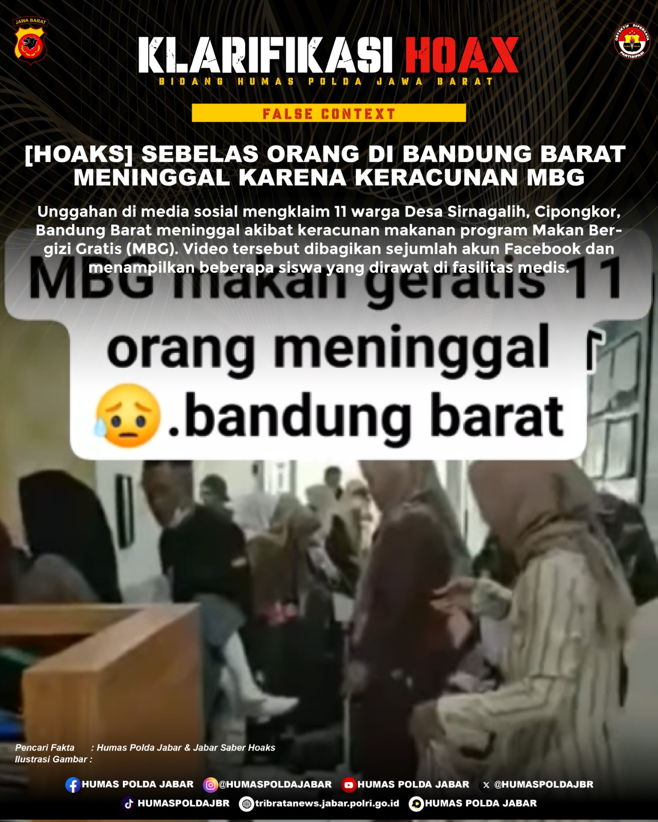 Video dengan klaim 11 orang di Desa Sirnagalih, Cipongkor, Bandung Barat meninggal akibat keracunan makanan program MBG merupakan informasi hoaks (false context). Faktanya, tidak ada korban meninggal, meski sebelumnya tercatat 1.315 warga mengalami keracunan massal dan Pemkab Bandung Barat sempat menetapkan status KLB.