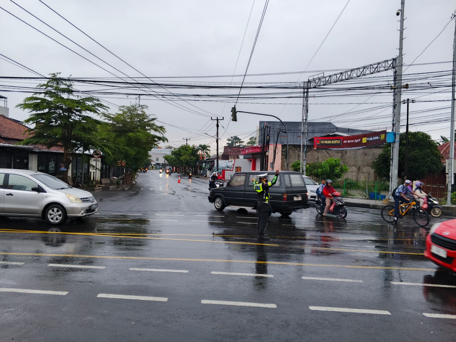 Tak hanya mengatur lalu lintas, para anggota juga menyampaikan imbauan Kamseltibcarlantas (Keamanan, Keselamatan, Ketertiban, dan Kelancaran Lalu Lintas) kepada pengguna jalan agar lebih berhati-hati saat melintas di jalan yang licin. Sapaan ramah dan senyum tulus dari petugas menjadi penghangat suasana pagi yang lembab, mencerminkan semangat pelayanan Polri yang humanis.