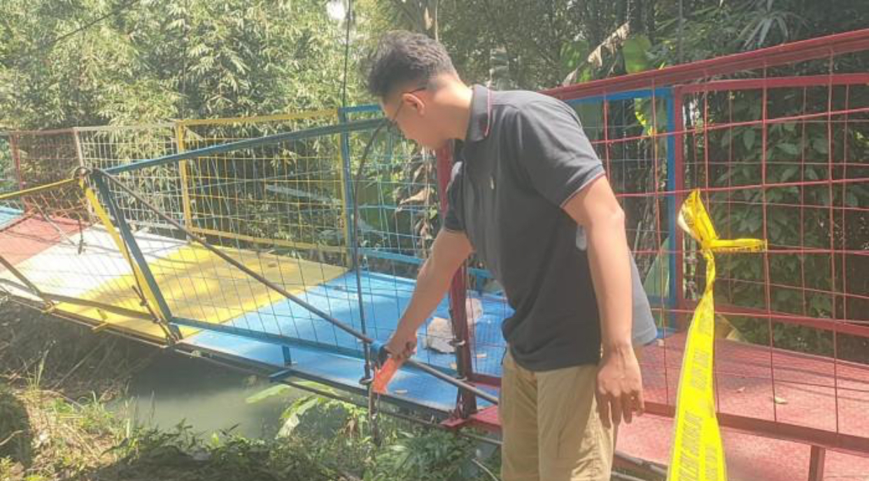 Pihak kepolisian tengah melakukan identifikasi dan olah tempat kejadian perkara (TKP) di lokasi jembatan gantung di Dusun Nengklok Desa Pajaten untuk mengetahui penyebab pasti kerusakan pagar jembatan.