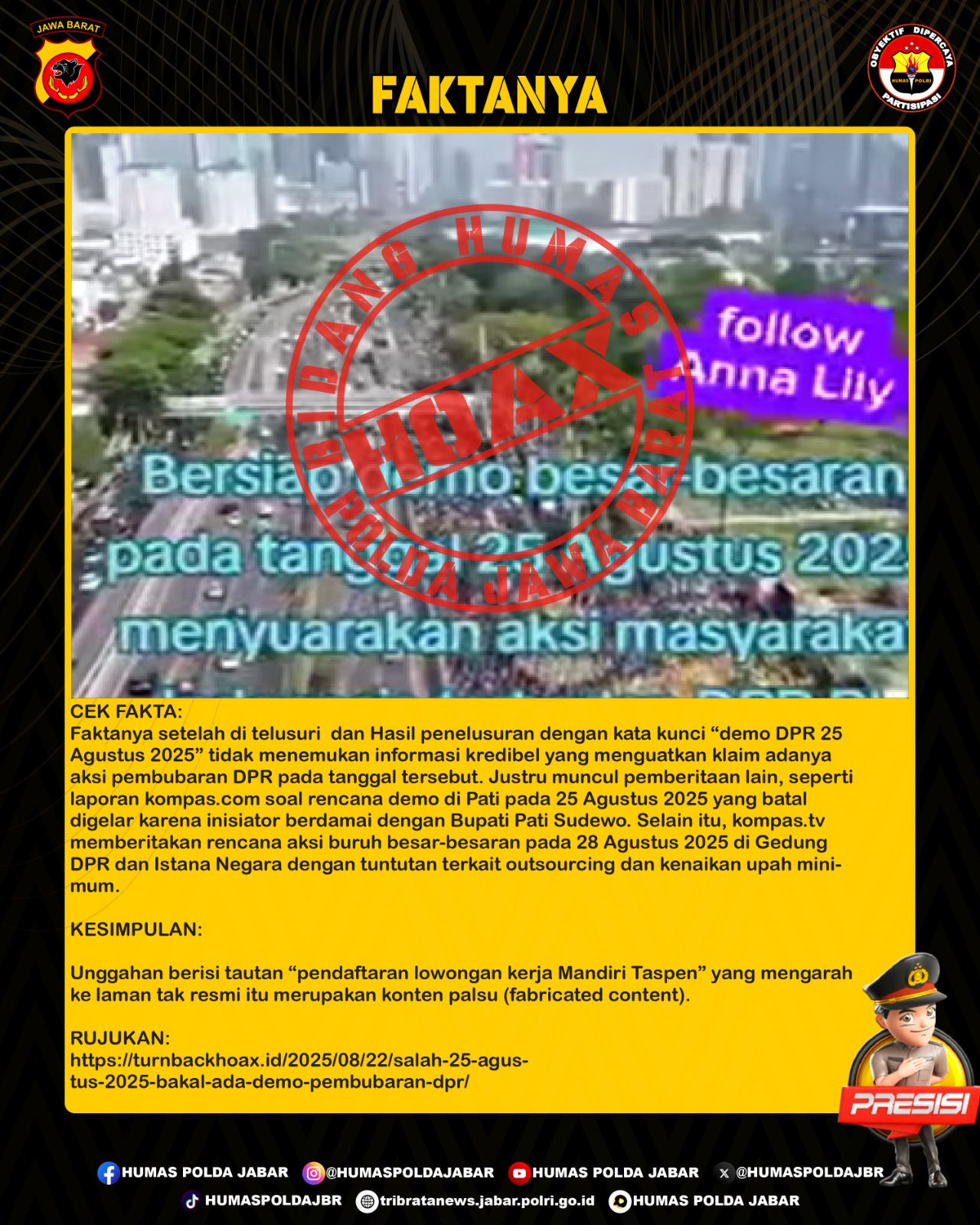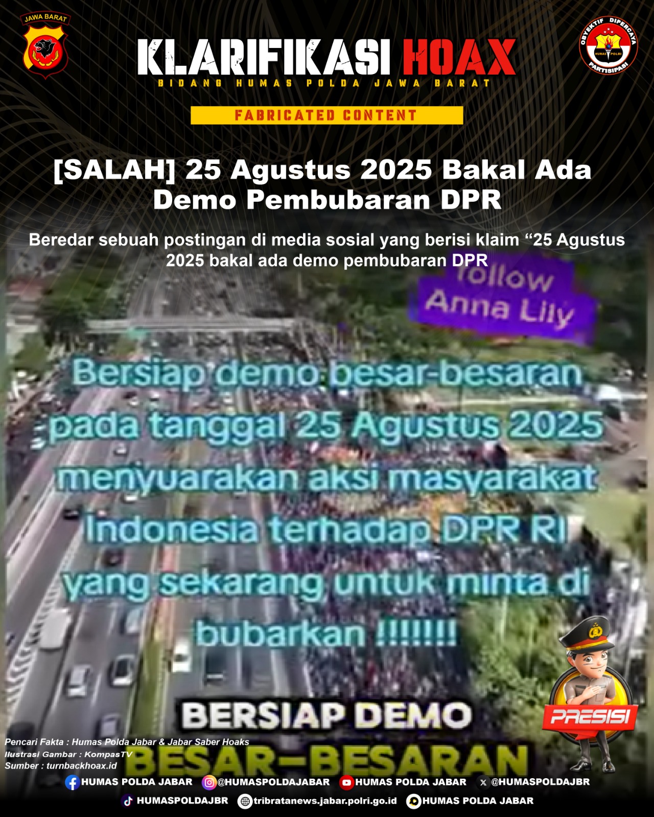 ![KLARIFIKASI HOAX – FABRICATED CONTENT [SALAH] 25 Agustus 2025 Bakal Ada Demo Pembubaran DPR](https://tribratanews.jabar.polri.go.id/wp-content/uploads/2025/09/WhatsApp-Image-2025-08-24-at-11.05.41-AM-750x375.jpeg)