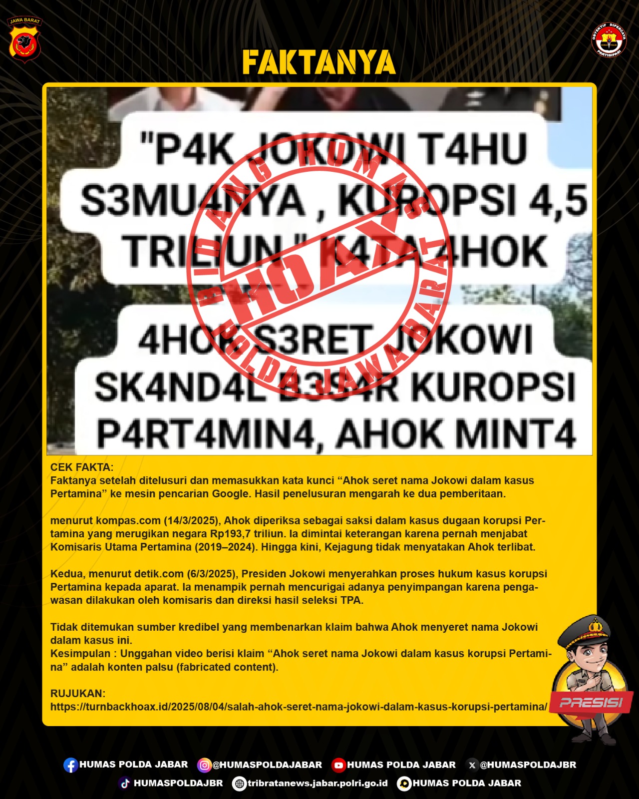 ![KLARIFIKASI HOAX – FABRICATED CONTENT [SALAH] Ahok Seret Nama Jokowi dalam Kasus Korupsi PERTAMINA](https://tribratanews.jabar.polri.go.id/storage/2025/08/WhatsApp-Image-2025-08-05-at-9.10.53-AM-750x375.jpeg)