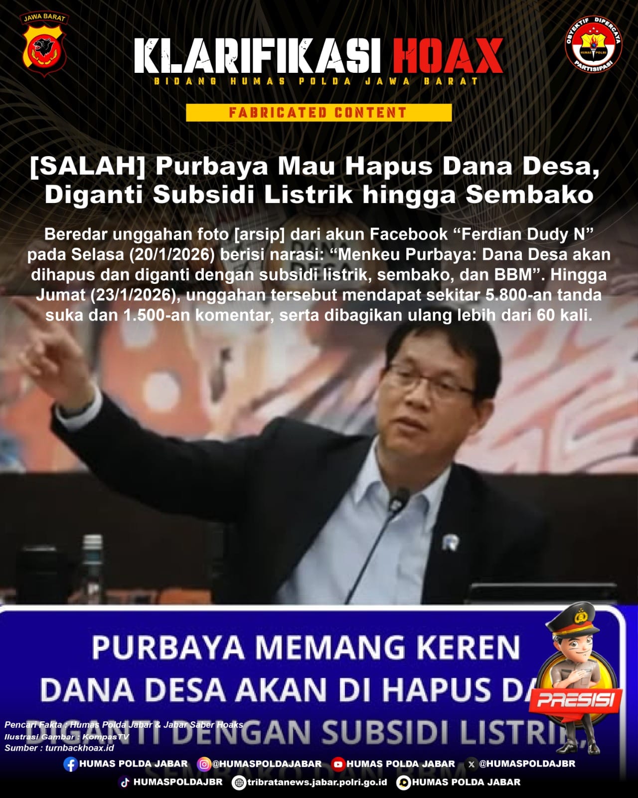 Beredar unggahan foto [arsip] dari akun Facebook “Ferdian Dudy N” pada Selasa (20/1/2026) berisi narasi: “Menkeu Purbaya: Dana Desa akan dihapus dan diganti dengan subsidi listrik, sembako, dan BBM”. Hingga Jumat (23/1/2026), unggahan tersebut mendapat sekitar 5.800-an tanda suka dan 1.500-an komentar, serta dibagikan ulang lebih dari 60 kali.
