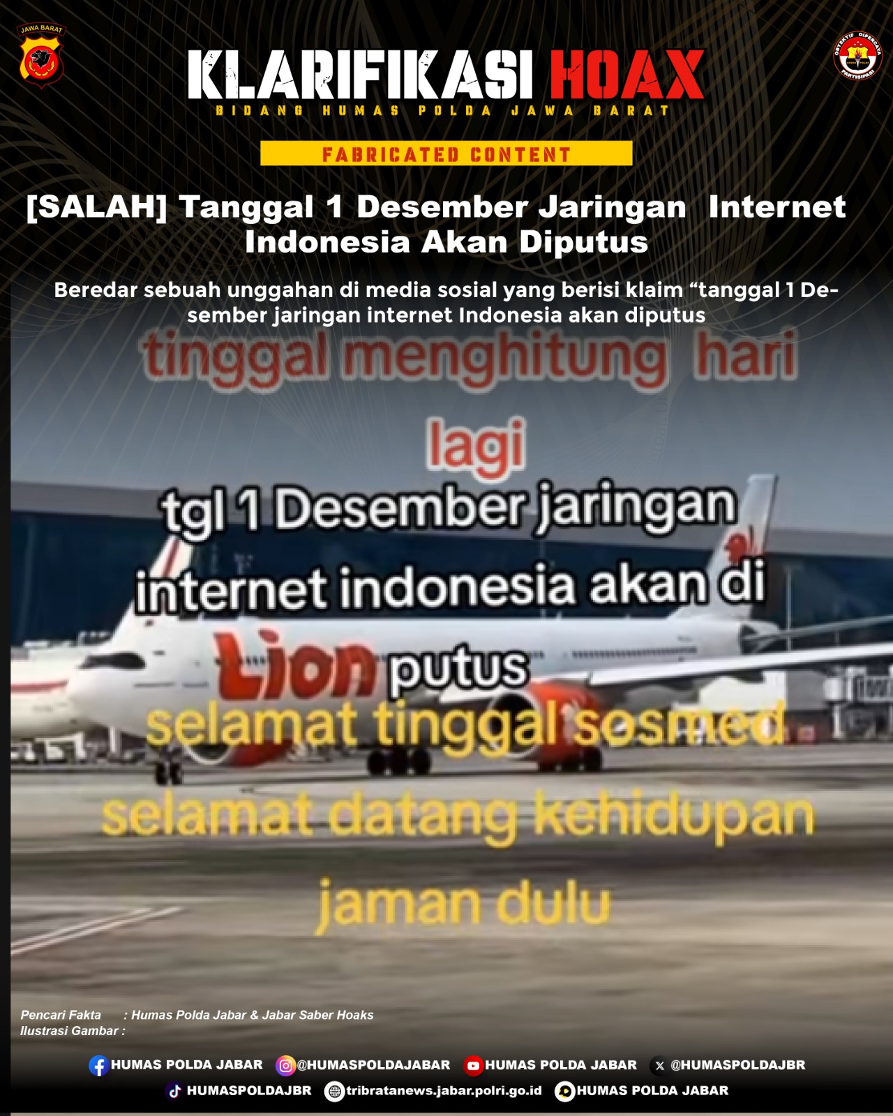 Beredar sebuah unggahan di media sosial yang berisi klaim “tanggal 1 Desember jaringan internet Indonesia akan diputus