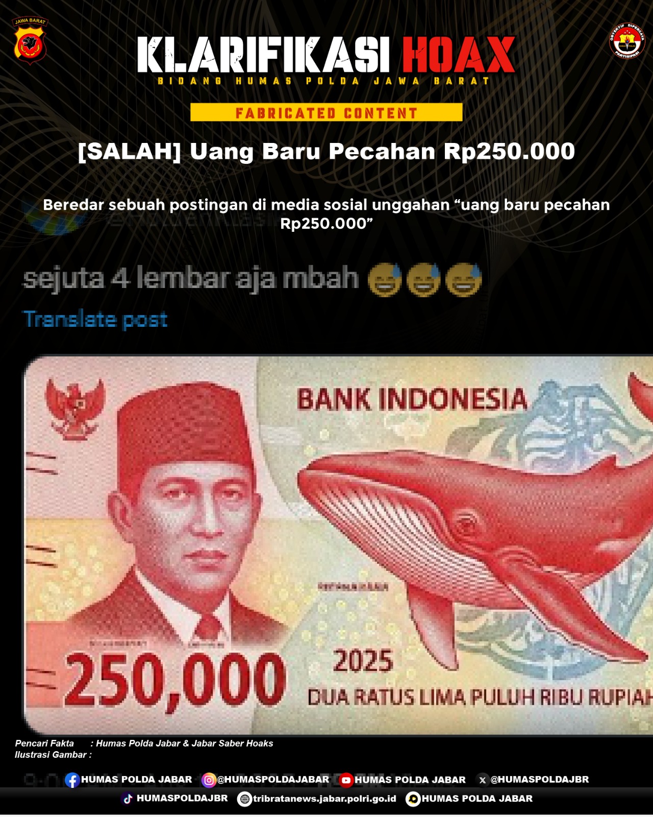 Unggahan “uang baru pecahan Rp250.000” adalah konten palsu (fabricated content).