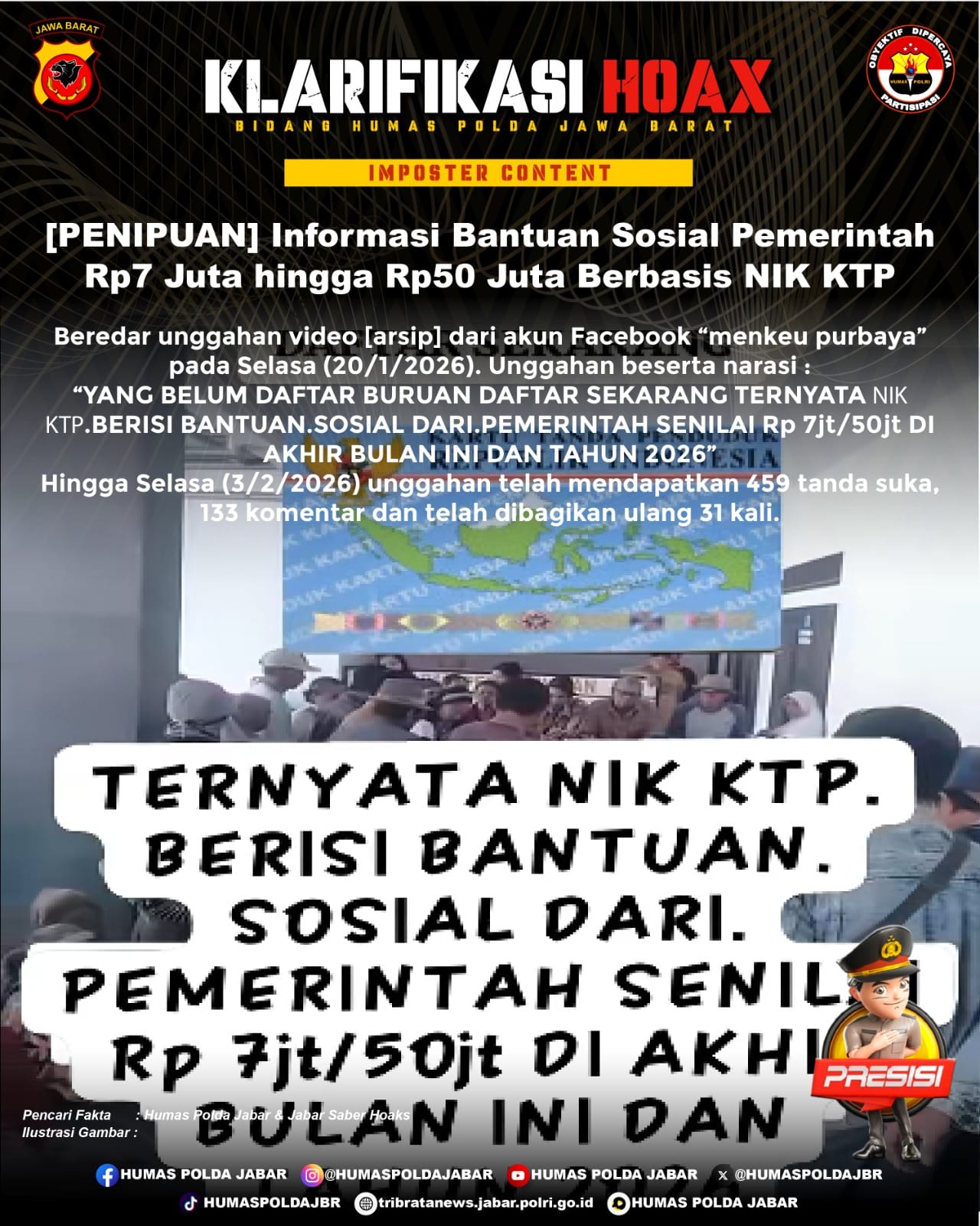 Kementerian Sosial juga mengingatkan bahwa seluruh informasi resmi terkait bantuan sosial hanya dapat diakses melalui situs resmi Kementerian Sosial di kemensos.go.id serta akun media sosial resmi Kementerian Sosial yang telah terverifikasi.