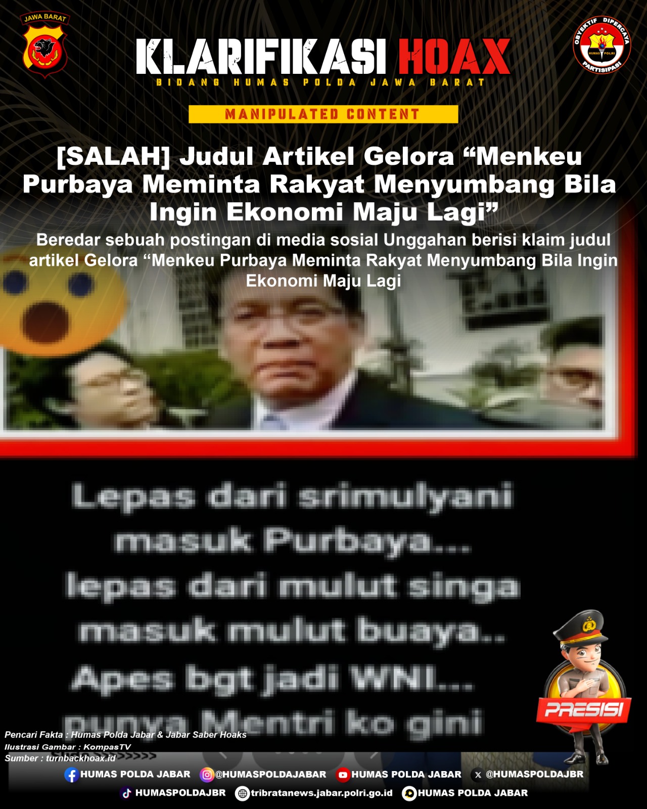 ![KLARIFIKASI HOAX – MANIPULATED CONTENT [SALAH] Judul Artikel Gelora “Menkeu Purbaya Meminta Rakyat Menyumbang Bila Ingin Ekonomi Maju Lagi”](https://tribratanews.jabar.polri.go.id/wp-content/uploads/2025/10/WhatsApp-Image-2025-10-05-at-11.06.33-AM-750x375.jpeg)