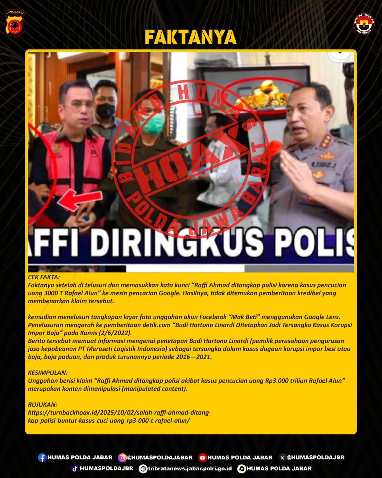 ![KLARIFIKASI HOAX – MANIPULATED CONTENT [SALAH] Raffi Ahmad Ditangkap Polisi, Buntut Kasus Cuci Uang Rp3.000 T Rafael Alun](https://tribratanews.jabar.polri.go.id/storage/2025/10/WhatsApp-Image-2025-10-03-at-9.17.52-AM-750x375.jpeg)