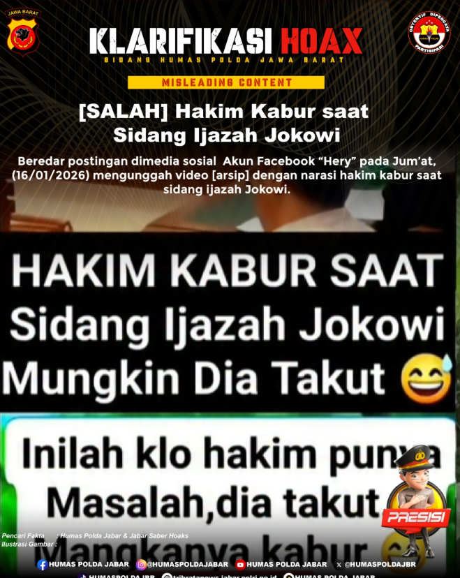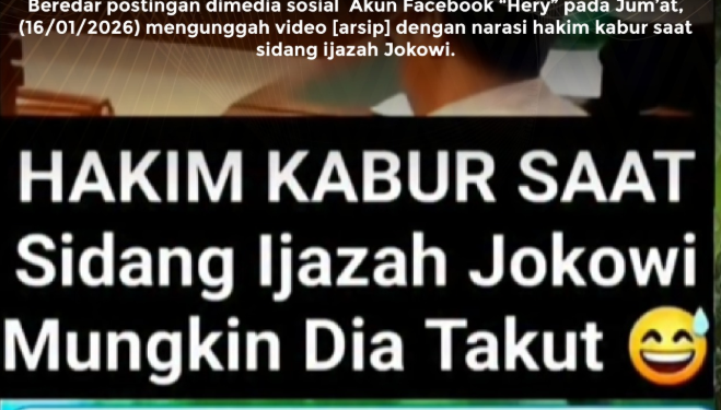 Beredar postingan dimedia sosial Akun Facebook “Hery” pada Jum’at, (16/01/2026) mengunggah video [arsip] dengan narasi hakim kabur saat sidang ijazah Jokowi.