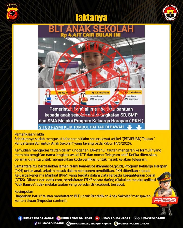 Sementara itu, berdasarkan laman resmi Kemensos (kemensos.go.id), Program Keluarga Harapan (PKH) untuk anak sekolah masuk dalam komponen pendidikan. PKH diberikan kepada Keluarga Penerima Manfaat (KPM) yang terdata dalam Data Terpadu Kesejahteraan Sosial (DTKS). Dilansir dari detik.com, pendaftaran DTKS secara daring dilakukan melalui aplikasi “Cek Bansos”, tidak melalui tautan yang beredar di Facebook tersebut.