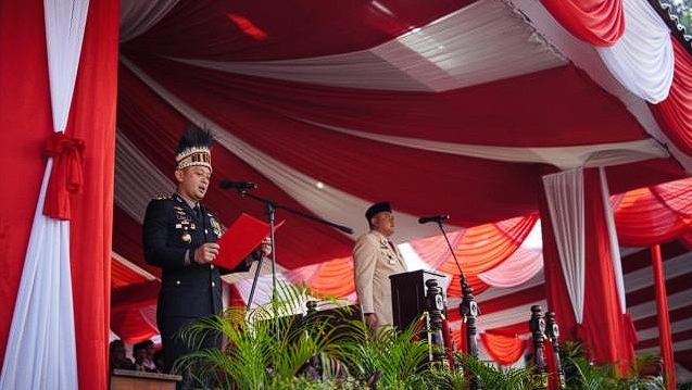 Kapolres Bogor, AKBP Wikha Ardilestanto, turut serta dalam upacara peringatan Hari Ulang Tahun (HUT) ke-80 Kemerdekaan Republik Indonesia yang digelar di Lapangan Tegar Beriman, Cibinong. Dalam upacara yang berlangsung khidmat pada Minggu (17/8/2025) ini, AKBP Wikha mendapat kehormatan untuk membacakan naskah Pancasila di hadapan seluruh peserta.