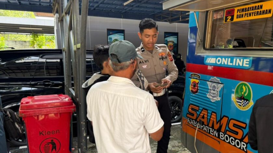 Pelayanan unit Registrasi dan Identifikasi (Regident), Satuan lalu lintas (Satlantas) Polres Bogor melaksanakan program Polantas menyapa dalam memberikan pelayanan kepada masyarakat secara Yan Drive Thru dan E-Samsat di kantor Samsat Cibinong, Senin (24/11/2025).