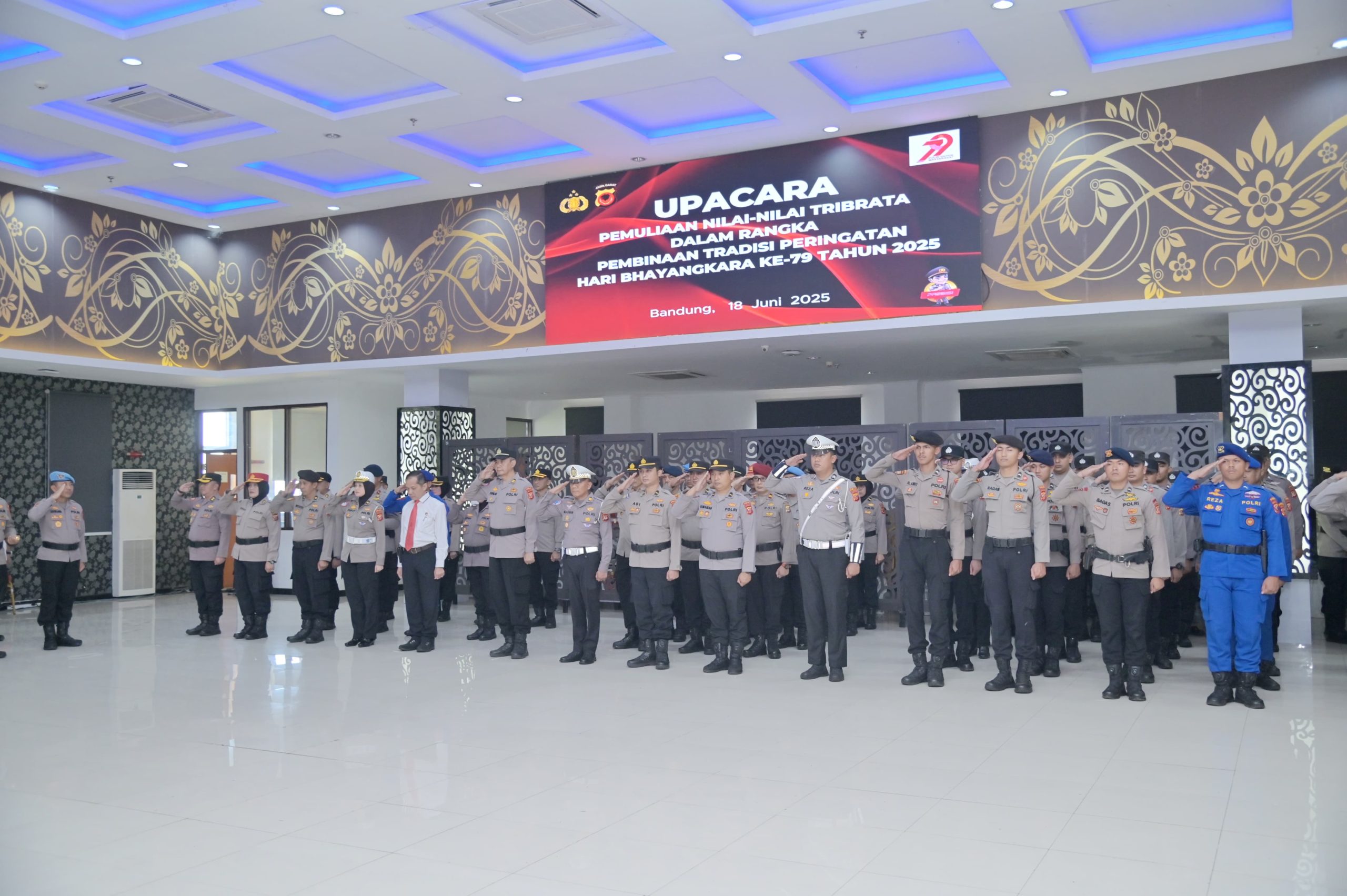 Bandung, Jawa Barat – Dalam suasana khidmat, Polda Jabar mengadakan Upacara Pemuliaan Nilai-Nilai Tribrata di Aula Dit Lantas Mapolda Jabar, Rabu (18/6/2025). Upacara ini merupakan bagian dari peringatan Hari Bhayangkara ke-79 dan dimaksudkan untuk memperteguh komitmen Polri dalam menjaga nilai-nilai luhur Tribrata sebagai pedoman moral dan etika insan Bhayangkara.