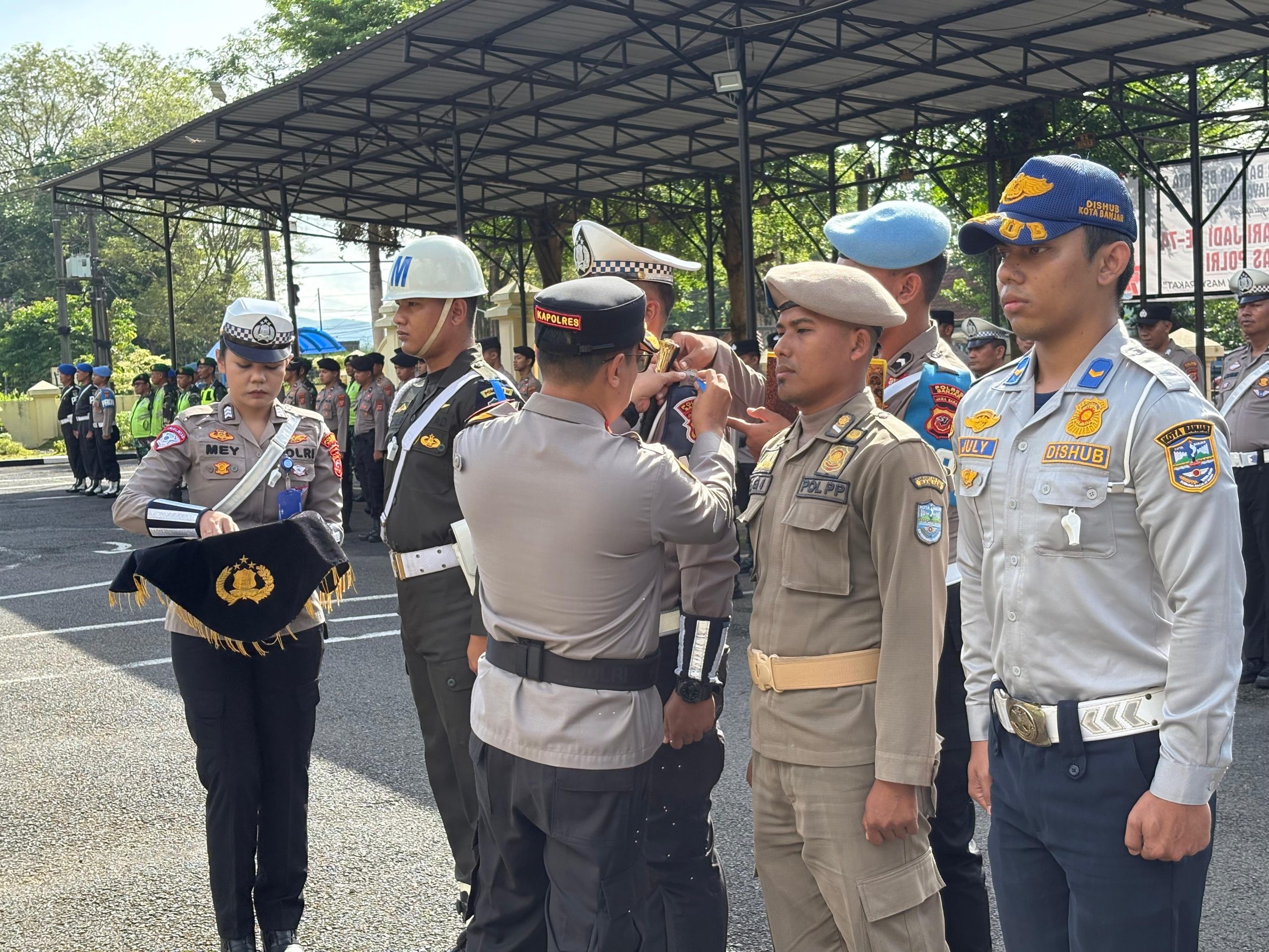 Apel ini dihadiri oleh sejumlah pejabat daerah penting, termasuk Wakil Wali Kota Banjar DR. H. Supriana, M.Pd, Ketua DPRD Kota Banjar Sutopo, S.Ip, Kajari Negeri Banjar Dr. Lukman Hakim Tuasikal, serta perwakilan dari TNI, Subdenpom, Dishub, Satpol PP, dan BPBD Kota Banjar. Sembilan peleton pasukan gabungan turut serta dalam apel tersebut, menunjukkan sinergi antar instansi dalam menjaga keamanan dan ketertiban lalu lintas.