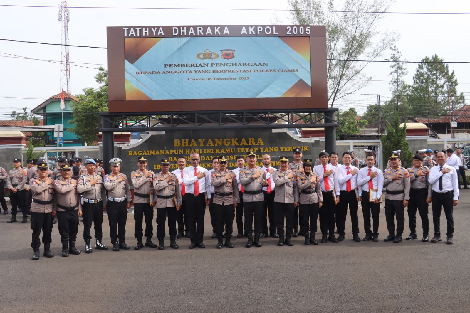 Polres Ciamis menggelar upacara pemberian penghargaan dan hadiah umroh gratis kepada lima personel berprestasi sebagai wujud apresiasi atas dedikasi dan kinerja unggul dalam melaksanakan tugas kepolisian. Upacara berlangsung di Lapangan Apel Polres Ciamis pada pukul 08.00 WIB, Senin, 8 Desember 2025.