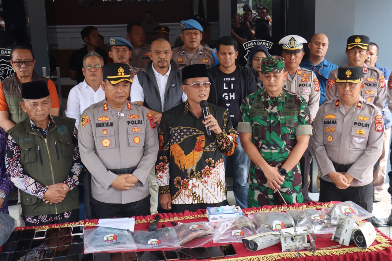 Dalam konferensi pers tersebut, Polres Ciamis juga memamerkan sejumlah barang bukti yang berhasil disita dari para tersangka, antara lain 13 unit sepeda motor yang digunakan oleh para pelaku, 20 unit telepon genggam yang diduga digunakan untuk berkomunikasi dan mengkoordinasikan aksi, pakaian yang dikenakan oleh para pelaku saat kejadian, serta berbagai benda yang digunakan untuk melakukan perusakan, seperti batu, pecahan kaca, serpihan pot bunga, dan besi.