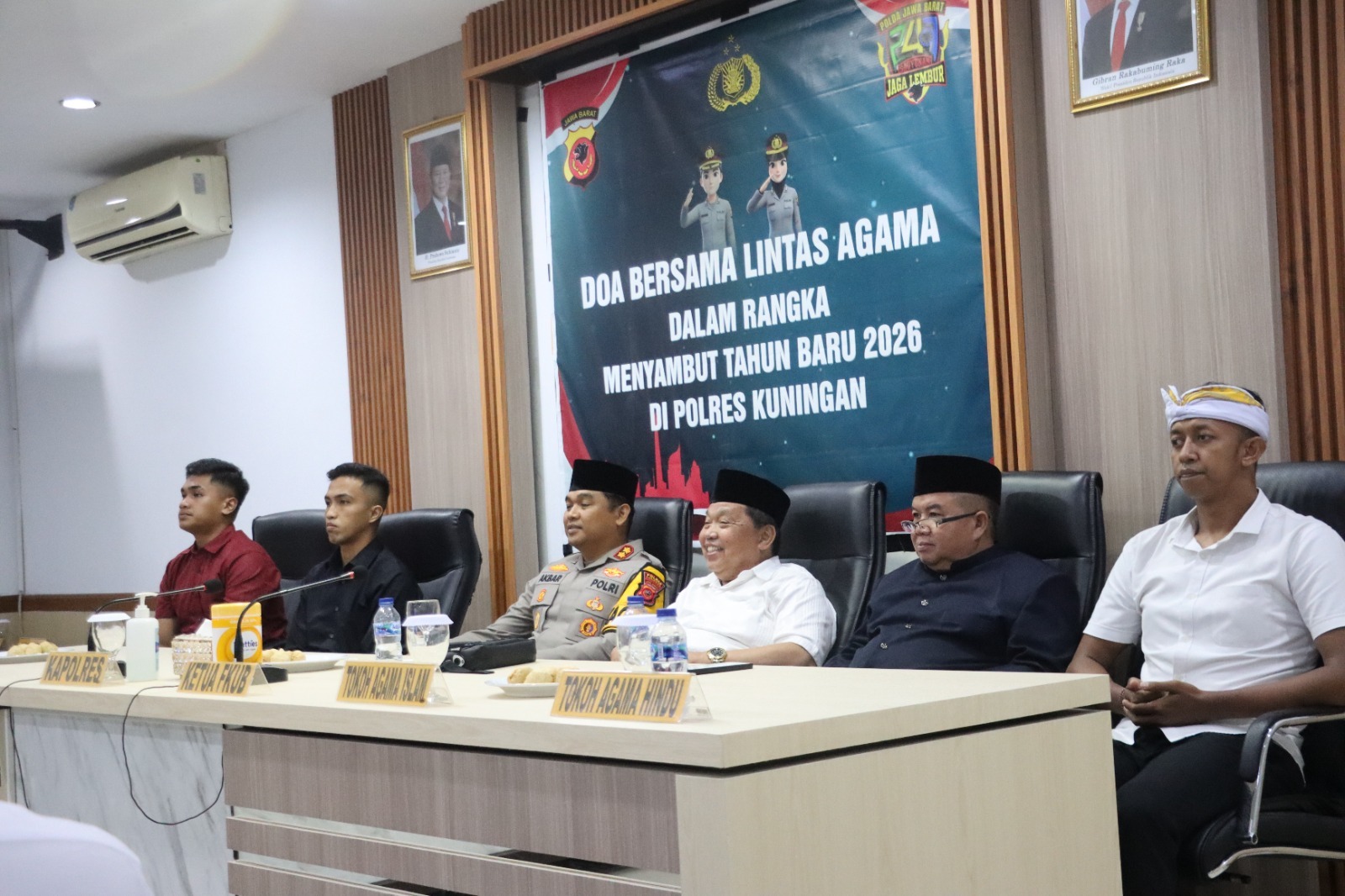 Menjelang detik-detik pergantian tahun 2025 ke 2026, Polres Kuningan menggelar kegiatan bermakna dengan memanjatkan doa bersama tokoh lintas agama. Kegiatan bertajuk “Doa Lintas Agama Jajaran Polda Jabar” ini dilaksanakan secara serentak melalui Zoom Meeting dan dipusatkan di Aula Rupatama Polres Kuningan, Rabu sore (31/12/2025).