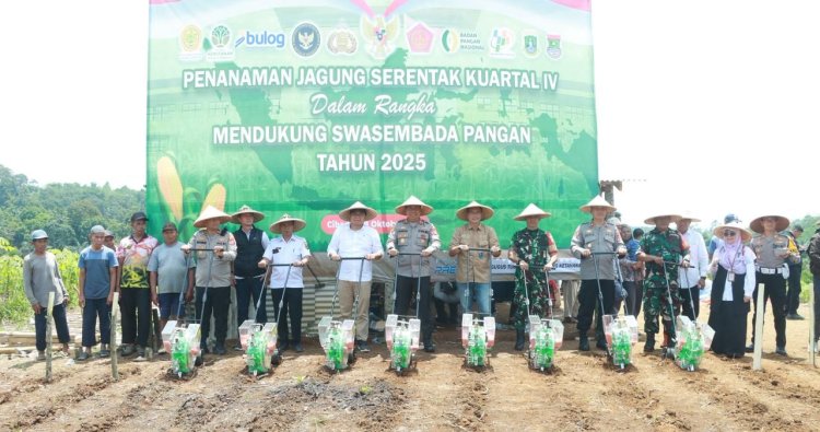 Polres Sukabumi menggelar kegiatan Penanaman Jagung Serentak Kuartal IV di lahan milik BUMDes Cipta Karya Mandiri, Desa Sukasirna, Kecamatan Cibadak, Kabupaten Sukabumi, Rabu (08/10/2025). Kegiatan yang dipimpin langsung oleh Kapolres Sukabumi, AKBP Dr. Samian, S.H., S.I.K., M.Si., bersama jajaran Forkopimcam, Dinas Pertanian, Bulog, serta masyarakat setempat ini, dilakukan di atas lahan seluas empat hektare sebagai bagian dari dukungan Polri terhadap program swasembada jagung nasional.