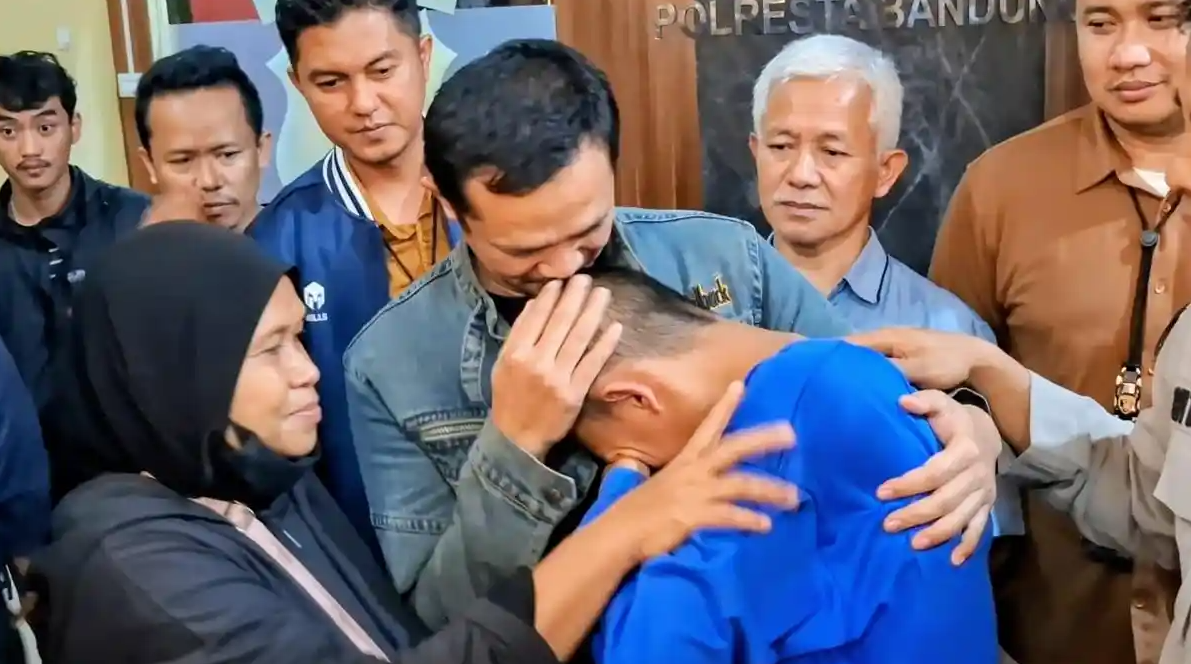 Suasana haru menyelimuti Mapolresta Bandung pada Minggu malam, 23 November 2025, saat Rizki Nur Fadhilah (18) tiba dan disambut oleh keluarganya. Rizki, yang sebelumnya berada di Kamboja, tampak menangis dalam pelukan erat sang ayah.