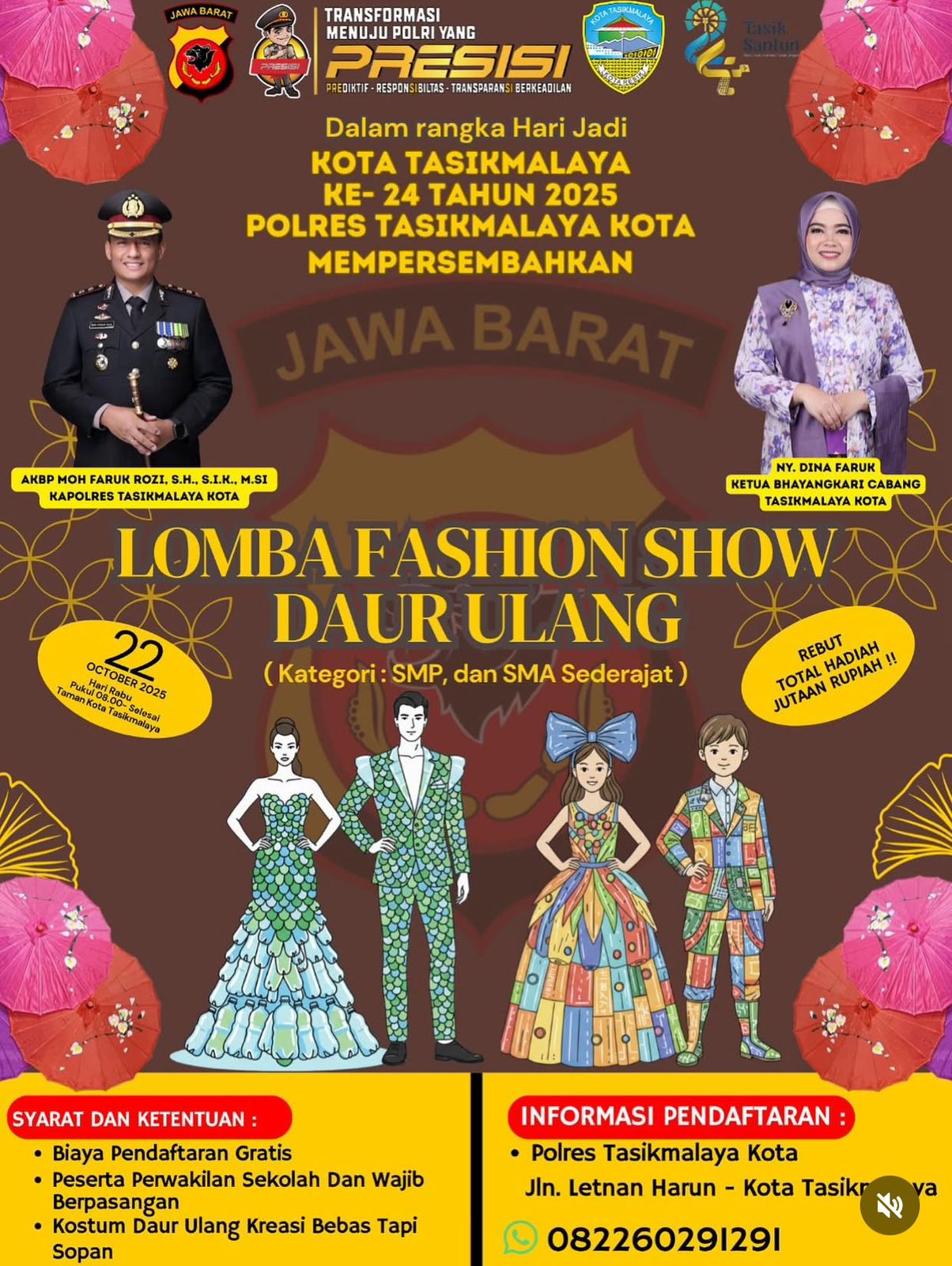 Dalam rangka memeriahkan Hari Ulang Tahun (HUT) ke-24 Kota Tasikmalaya, Polres Tasikmalaya Kota akan menyelenggarakan kegiatan Lomba Fashion Show Daur Ulang. Ajang kreativitas ini dijadwalkan berlangsung di Taman Kota Tasikmalaya pada Selasa, 22 Oktober 2025.