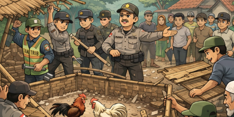 Setibanya di lokasi, petugas langsung melakukan pengecekan tempat kejadian perkara (TKP). Setelah dilakukan pemeriksaan, petugas bersama warga melaksanakan pembongkaran terhadap lapak yang diduga digunakan sebagai sarana praktik perjudian sabung ayam.