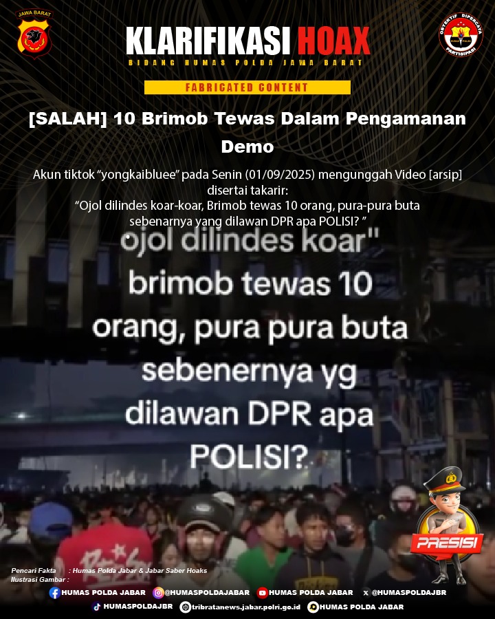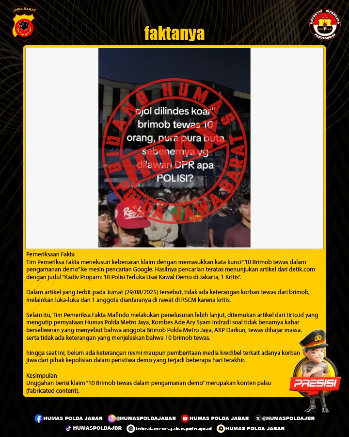 Unggahan berisi klaim “10 Brimob tewas dalam pengamanan demo” merupakan konten palsu (fabricated content).