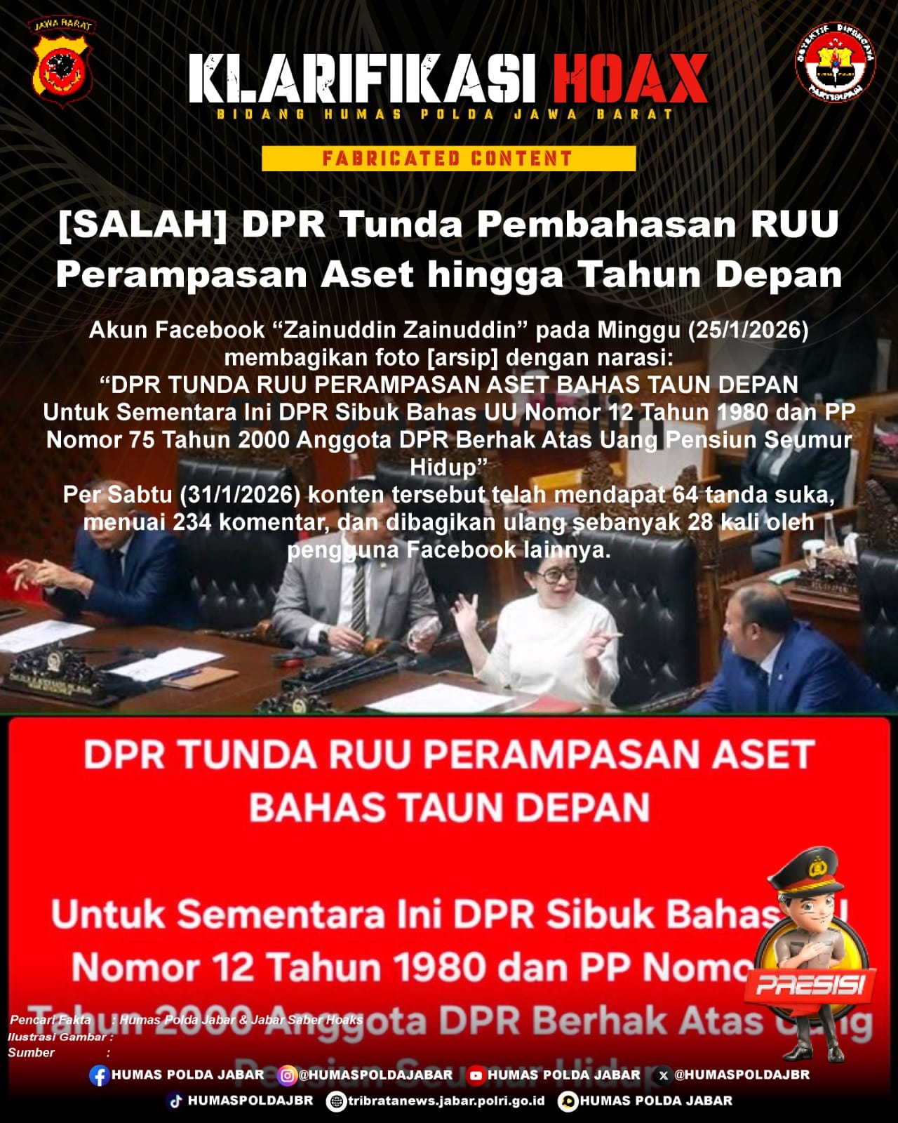 Sepanjang penelusuran, tidak ditemukan informasi dari sumber kredibel yang membenarkan klaim “DPR tunda pembahasan RUU Perampasan Aset hingga tahun depan”.