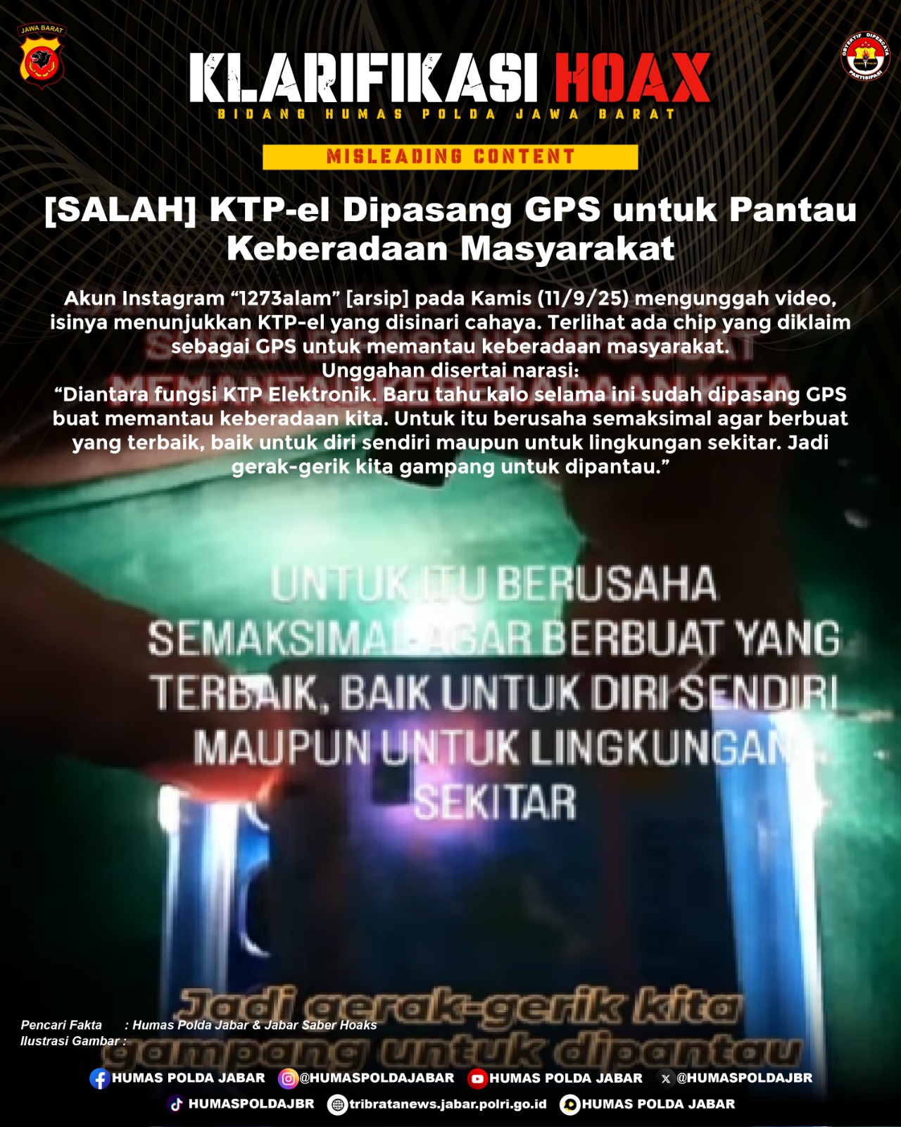 Akun Instagram “1273alam” [arsip] pada Kamis (11/9/25) mengunggah video, isinya menunjukkan KTP-el yang disinari cahaya. Terlihat ada chip yang diklaim sebagai GPS untuk memantau keberadaan masyarakat.