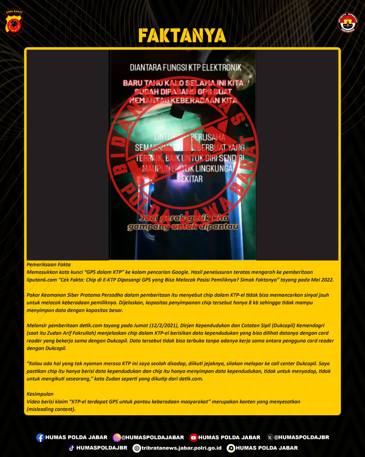 Video berisi klaim “KTP-el terdapat GPS untuk pantau keberadaan masyarakat” merupakan konten yang menyesatkan (misleading content).