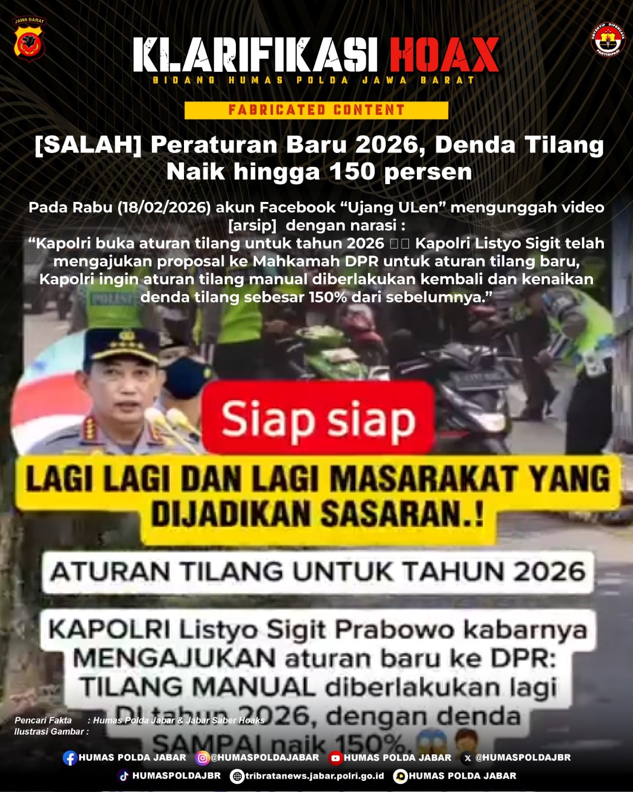 Tidak ada kebijakan resmi dari Polri terkait kenaikan denda tilang. Unggahan dengan narasi “Peraturan baru 2026, denda tilang naik hingga 150 persen” merupakan konten palsu (fabricated content).