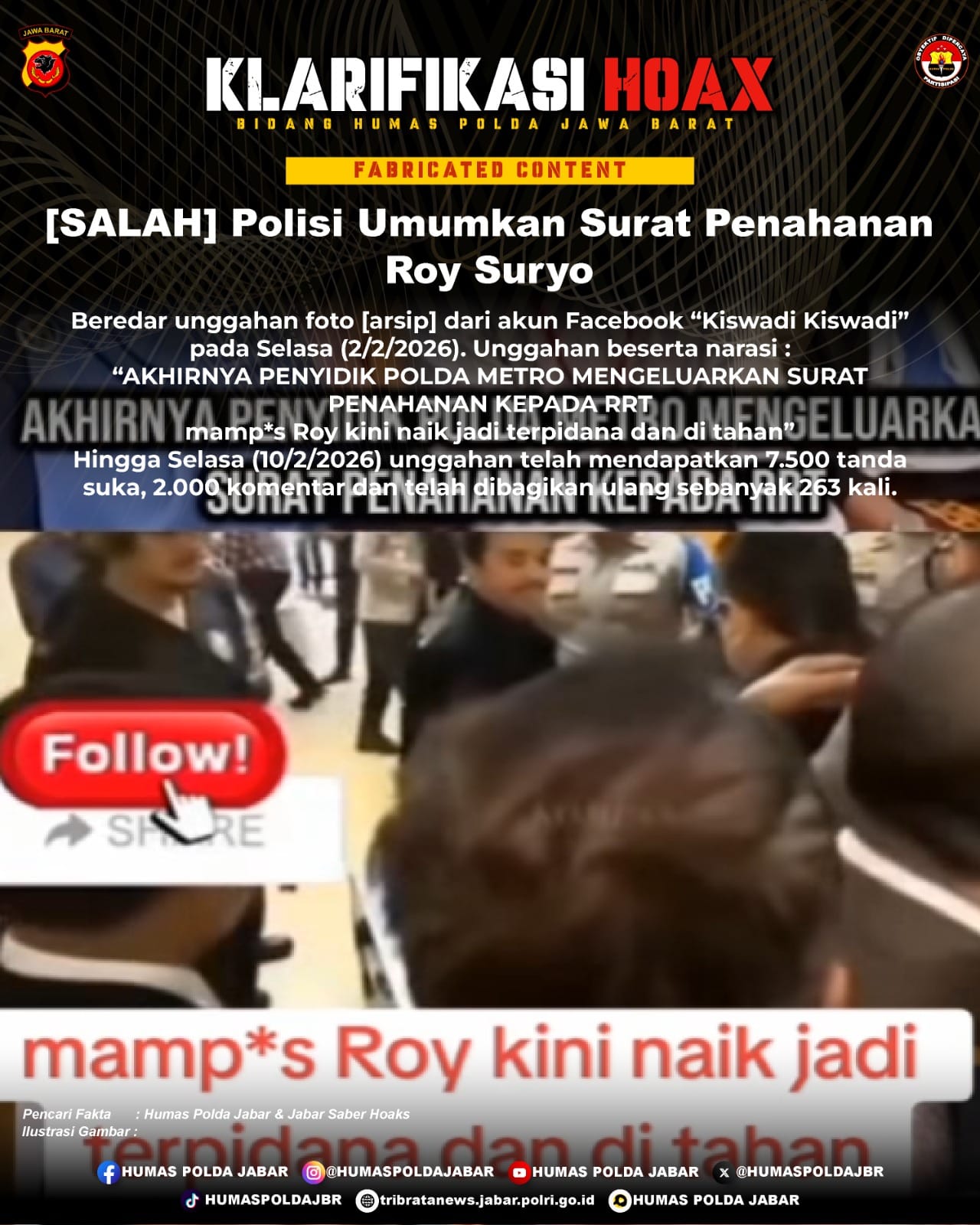 Faktanya, video yang beredar merupakan dokumentasi penahanan Ambroncius Nababan pada 2021 dan tidak berkaitan dengan Roy Suryo. Sementara itu, foto yang menampilkan Roy Suryo dan Rismon Sianipar menangis tidak didukung bukti peristiwa nyata. Unggahan video berisi klaim “polisi umumkan surat penahanan Roy Suryo” merupakan konten palsu (fabricated content).