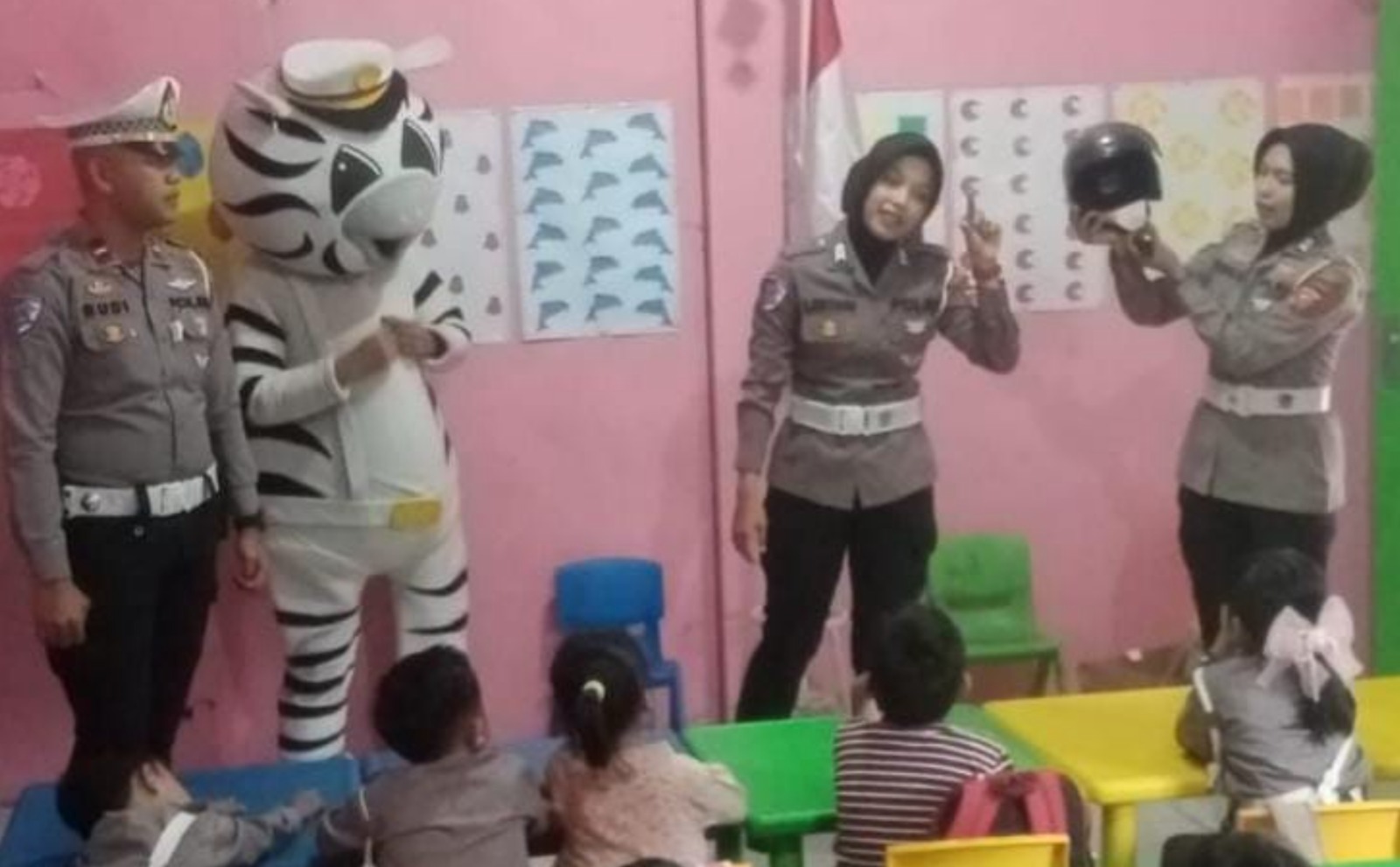 Kanit Kamsel Satlantas Polres Ciamis Polda Jabar, Ipda Budi Setiawan, bersama dua personel Polwan Polres Ciamis, hadir untuk mengenalkan diri sebagai personel Polri dan menyampaikan pentingnya disiplin berlalu lintas di jalan raya. Mereka mengenalkan rambu-rambu lalu lintas dan pentingnya penggunaan helm berstandar SNI saat berkendara roda dua, serta penggunaan sabuk pengaman saat menggunakan kendaraan roda empat.